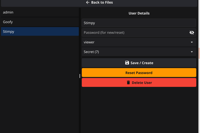 User Management: Admins can create new accounts and modify existing user roles/clearance levels directly from the Admin Panel.